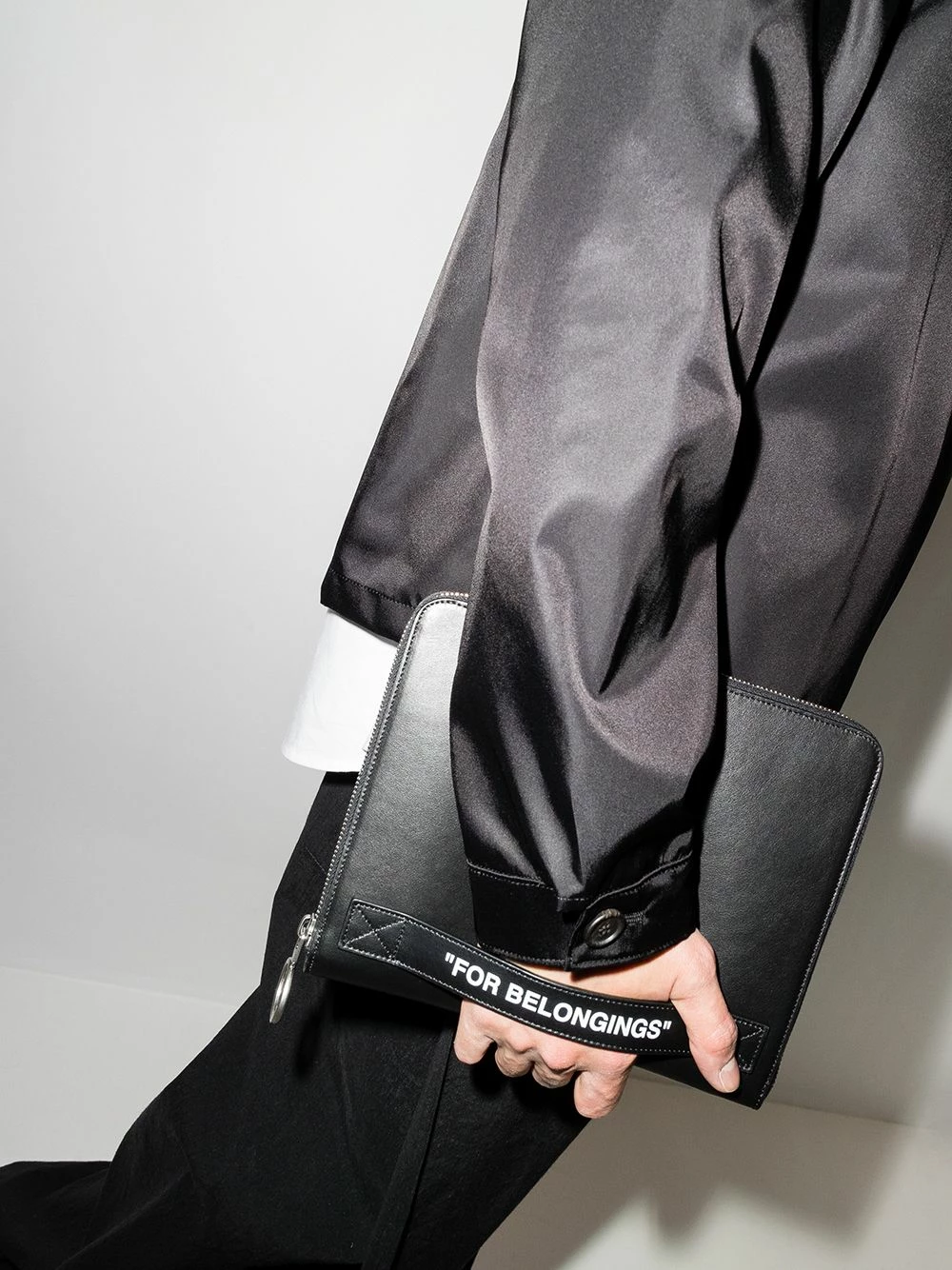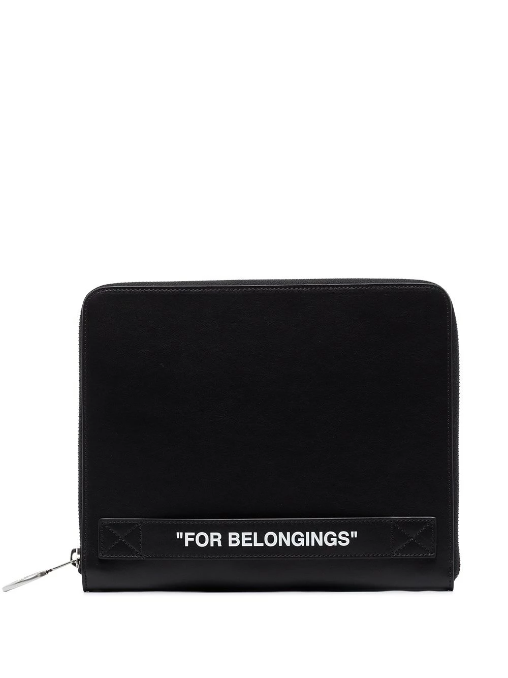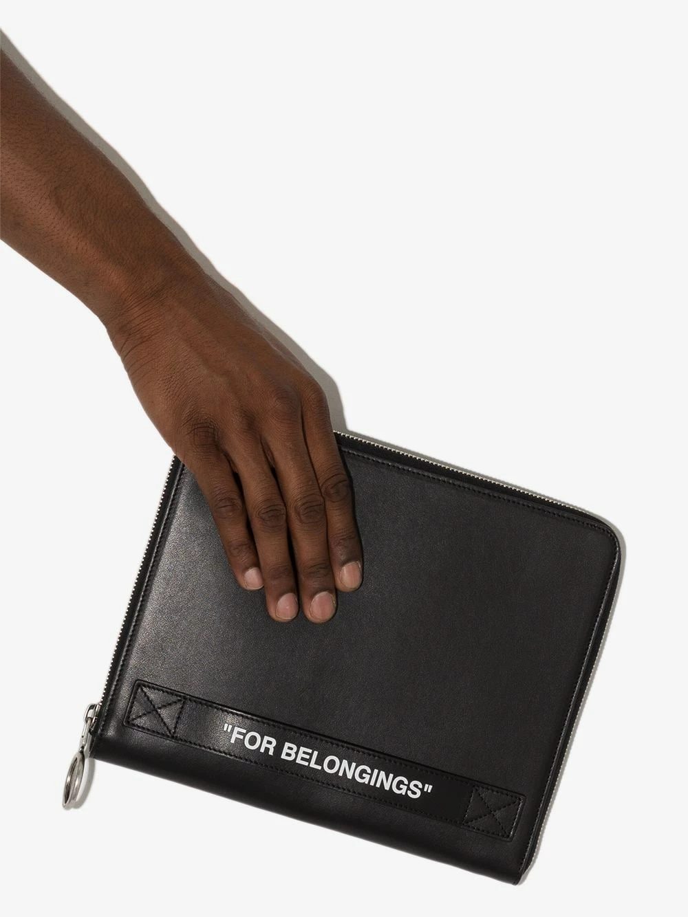 Stating the obvious with Off-White. Constructed from black calf leather and boasting the iconic Quote print to the front, this clutch bag is ideal for carrying your belongings. It will look just as great empty, though.