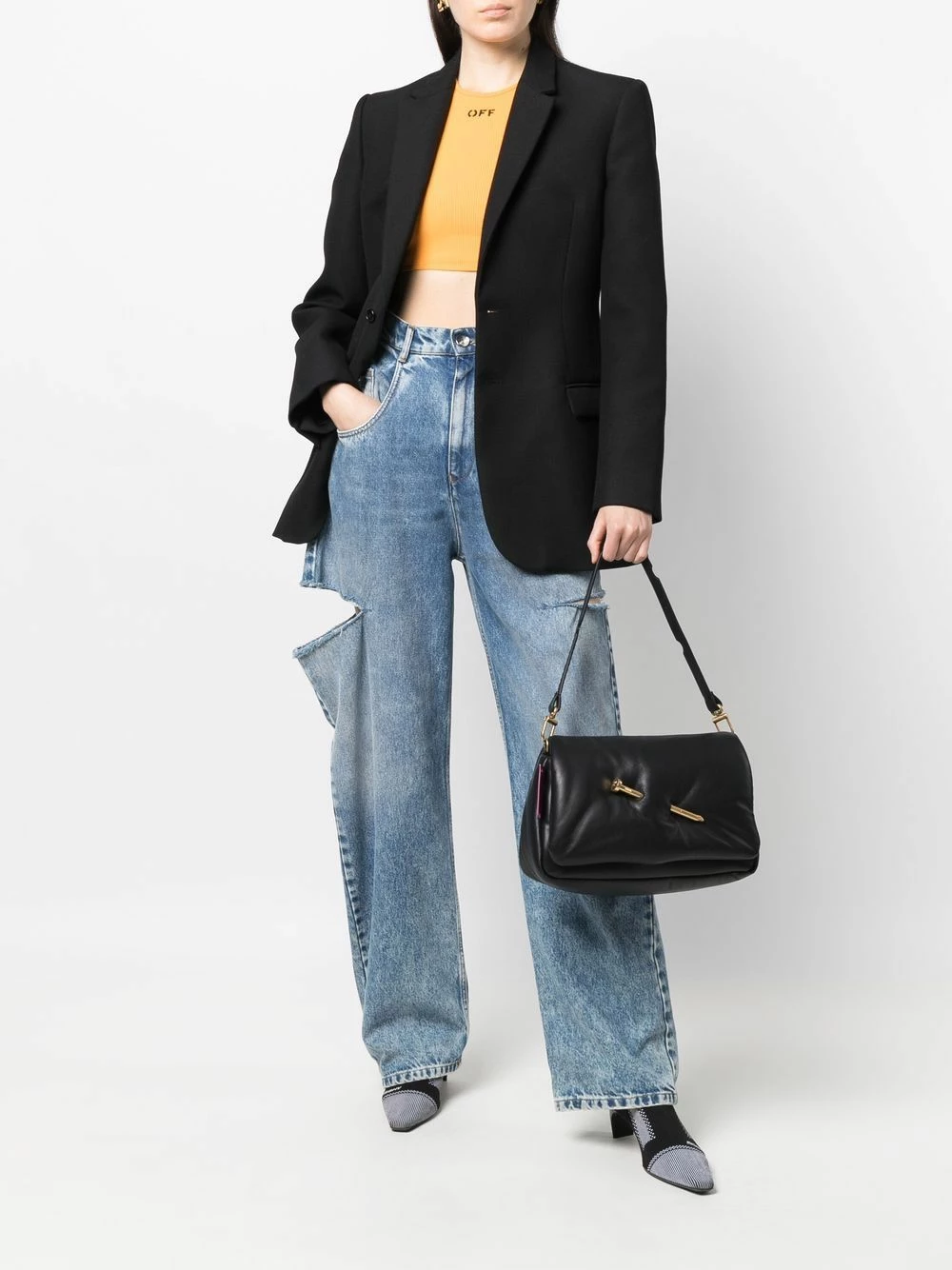 The Off-White “Puncture” bag stands out thanks to its gold-tone metal nail on the front. Part of the brand’s AW21 collection, this design is crafted from black leather and can be used as a shoulder bag, or even as a clutch – thanks to its detachable strap.