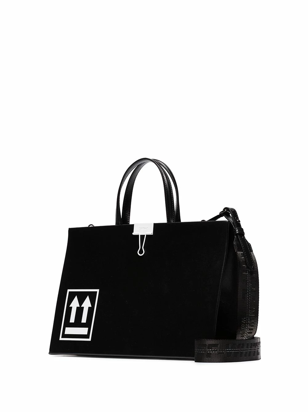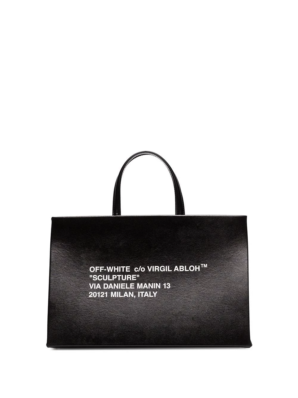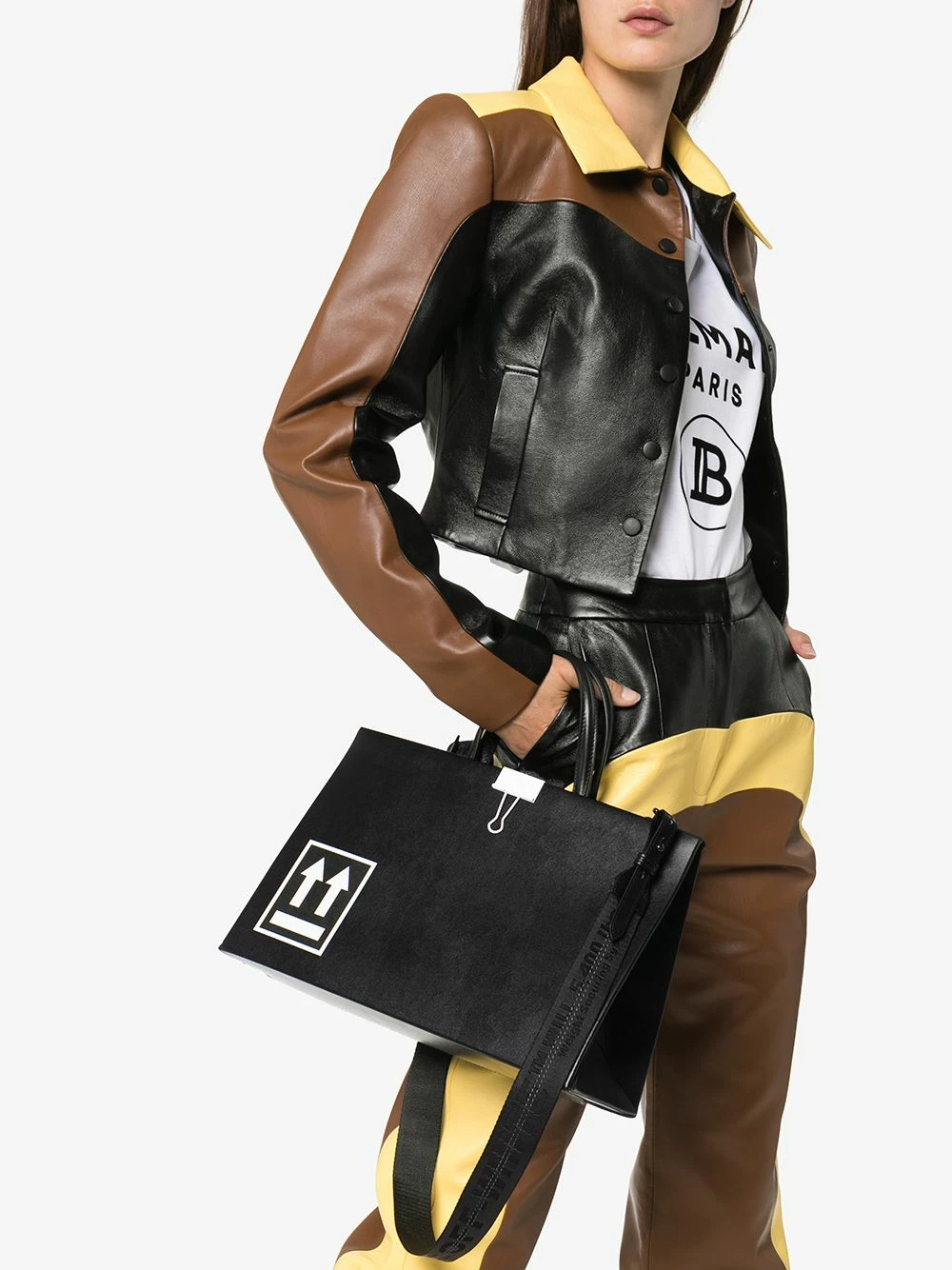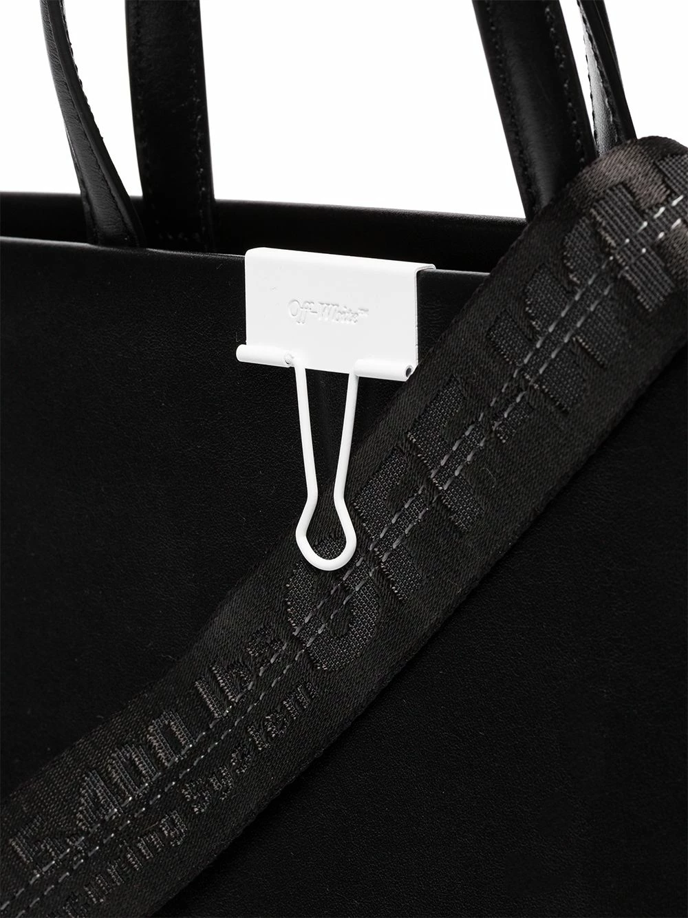 Off-White โdefines the grey area between black and whiteโ. What does that mean? A fresh reinterpretation of styles you know and love. This black leather medium box tote from Off-White features top handles, a detachable industrial logo strap, a white binder clip with engraved logo, an arrows logo print to the front and printed branding to the back.