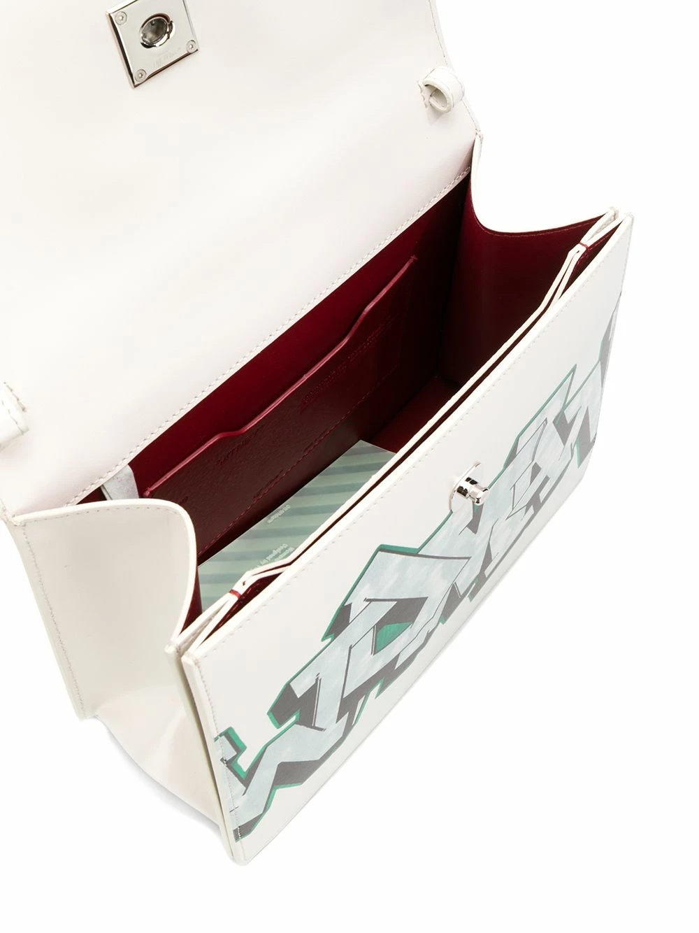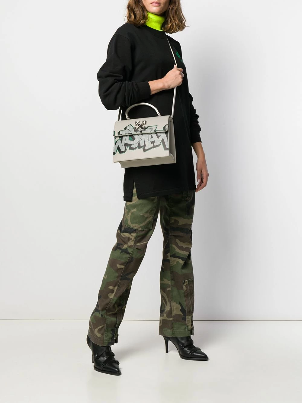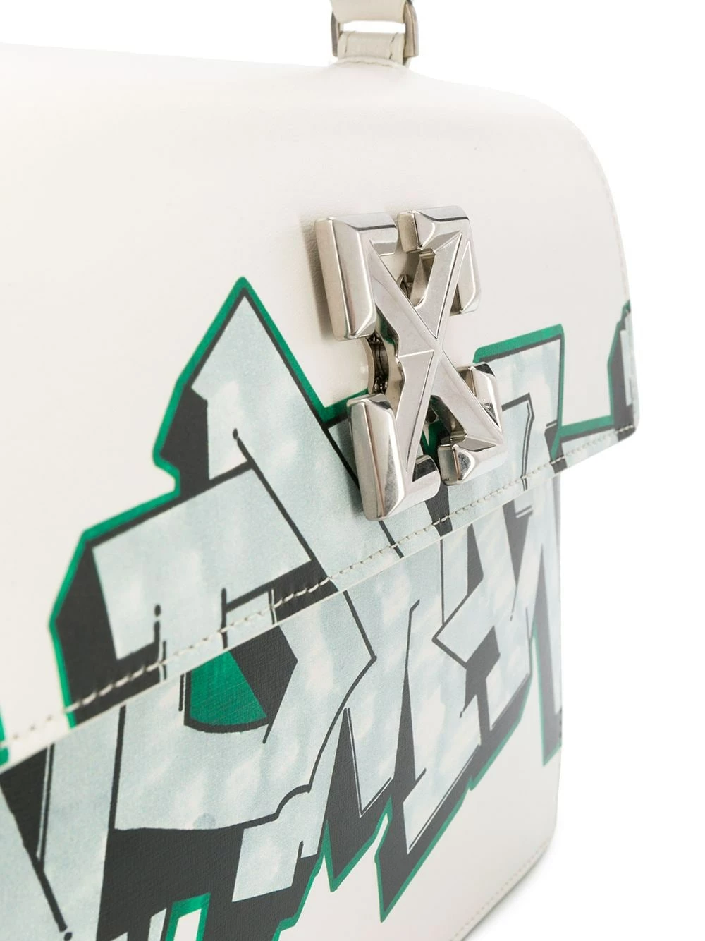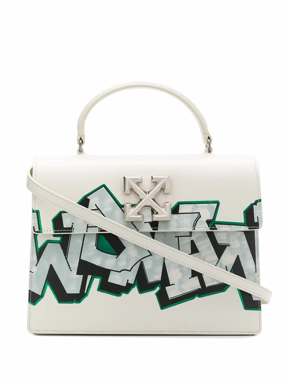 Channel your inner rebel with this off-white calf leather Jitney graffiti tote from Off-White. If you can’t go breaking the law and painting the city walls, you might as well throw it all out and express yourself in a different way. See? No need to go to jail over it. Featuring a top handle, a detachable shoulder strap, a back slip pocket, a foldover top with magnetic closure, a main internal compartment, an internal slip pocket, silver-tone hardware, a signature Diagonal Arrows logo plaque to the front and a striking graffiti print across the front.