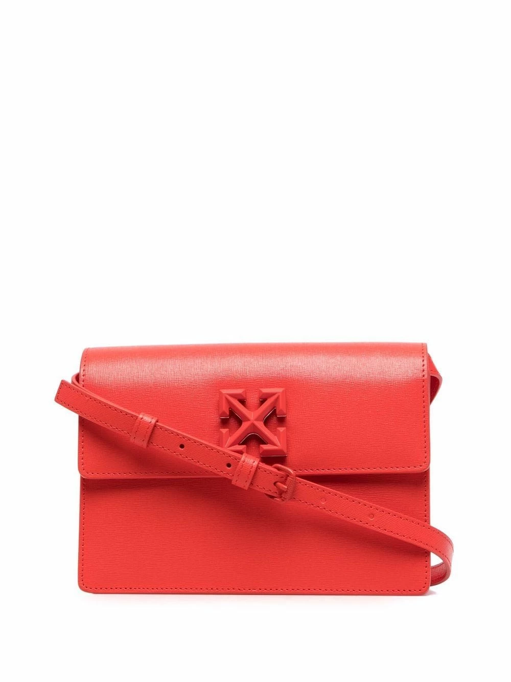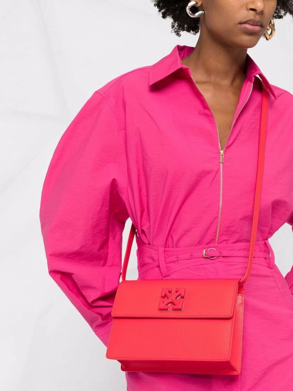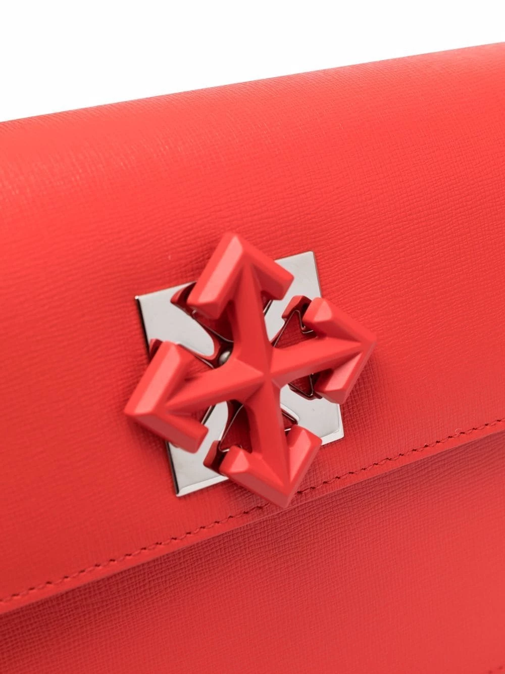 Off-White’s fire red Jitney shoulder bag is made from matte textured leather and is characterised by the brand’s signature arrow plaque to the front. This tonal plaque can be twisted to reveal a hidden silver-tone plaque underneath.ย