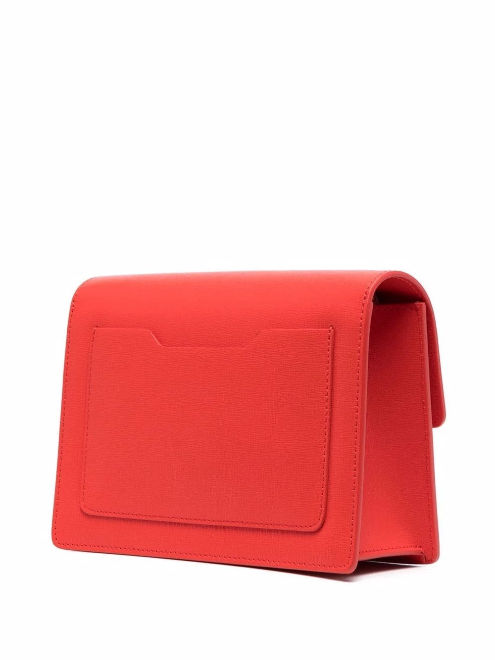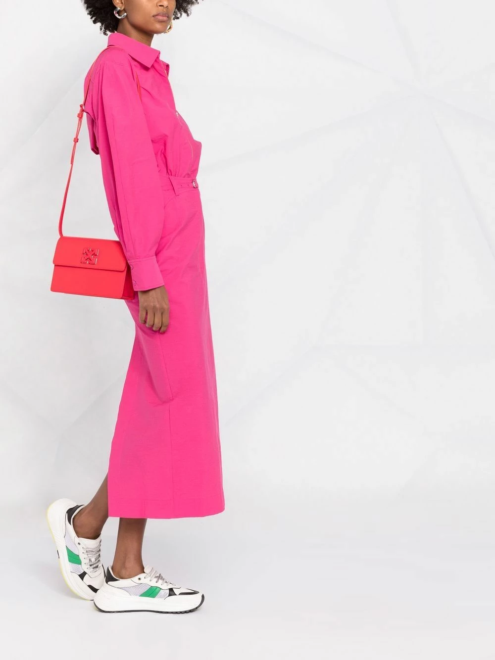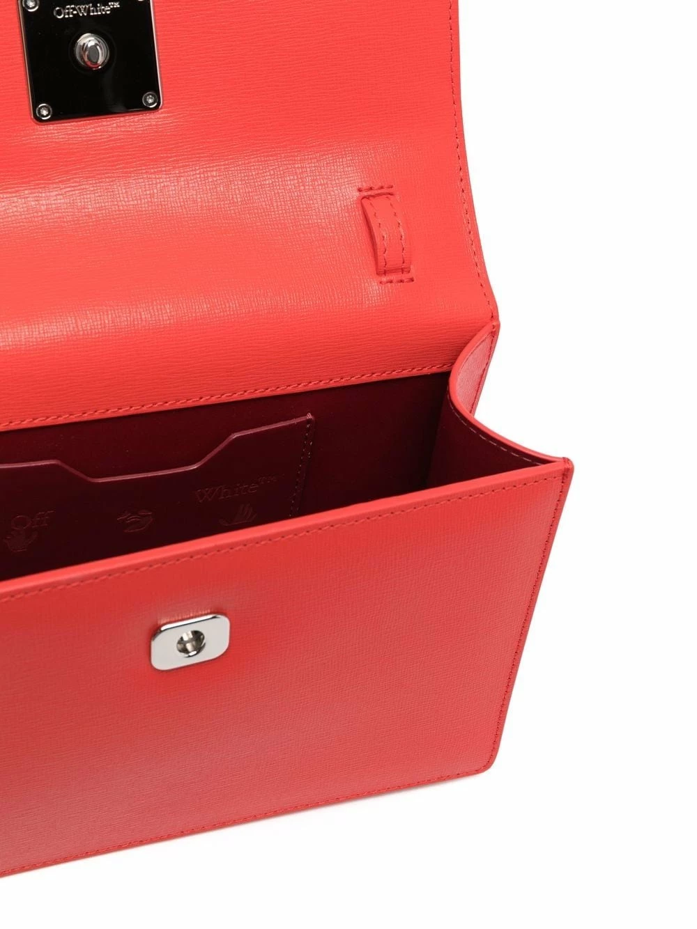 Off-White’s fire red Jitney shoulder bag is made from matte textured leather and is characterised by the brand’s signature arrow plaque to the front. This tonal plaque can be twisted to reveal a hidden silver-tone plaque underneath.ย